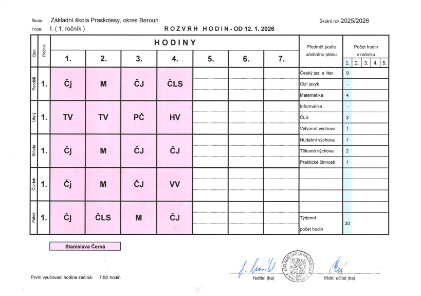 Rozvrh hodin – I. třída