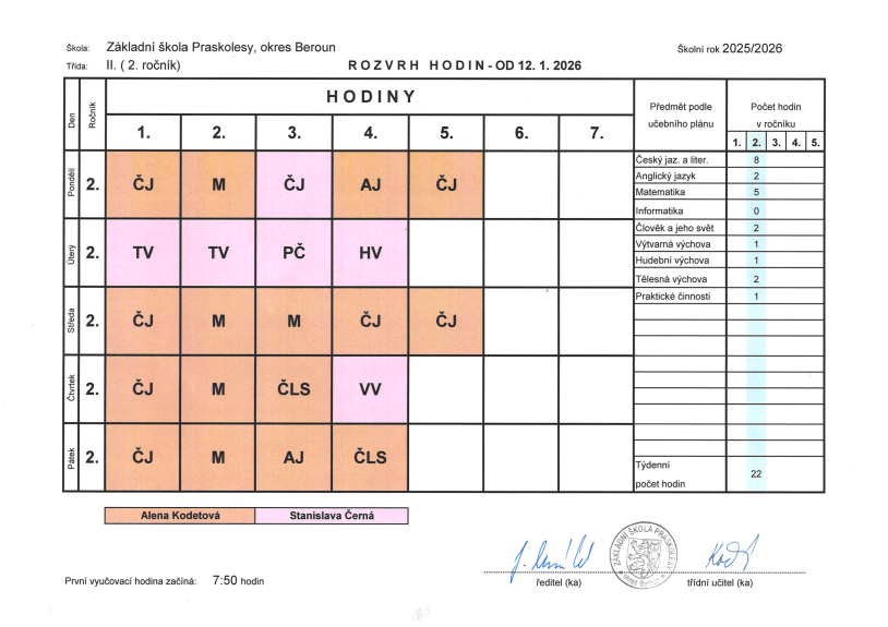 Rozvrh hodin – II. třída