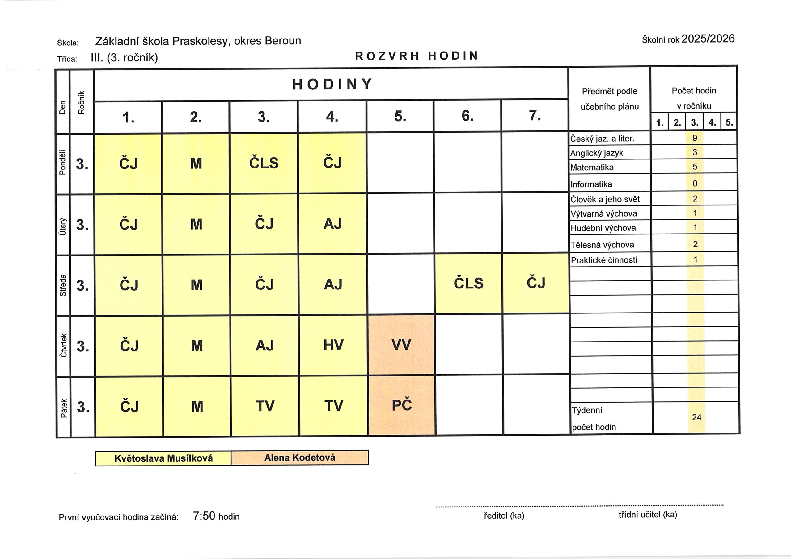 Rozvrh hodin – III. třída
